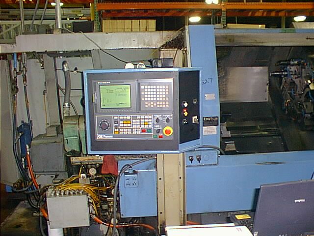 This is another flat bed lathe with turrets. On this Mazak lathe, we replaced the axis motors and drives with new AC brushless units.